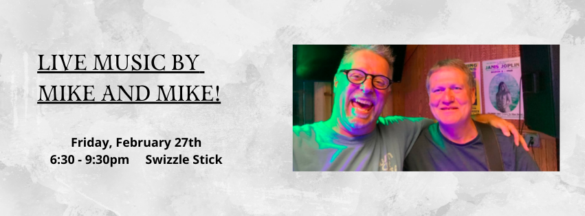 “Mike and Mike” will be playing LIVE in the Swizzle Stick! They play your familiar soft rock hits from the past! Music starts at 6:30pm. Come out for some great drinks, great food, and live tunes! |
